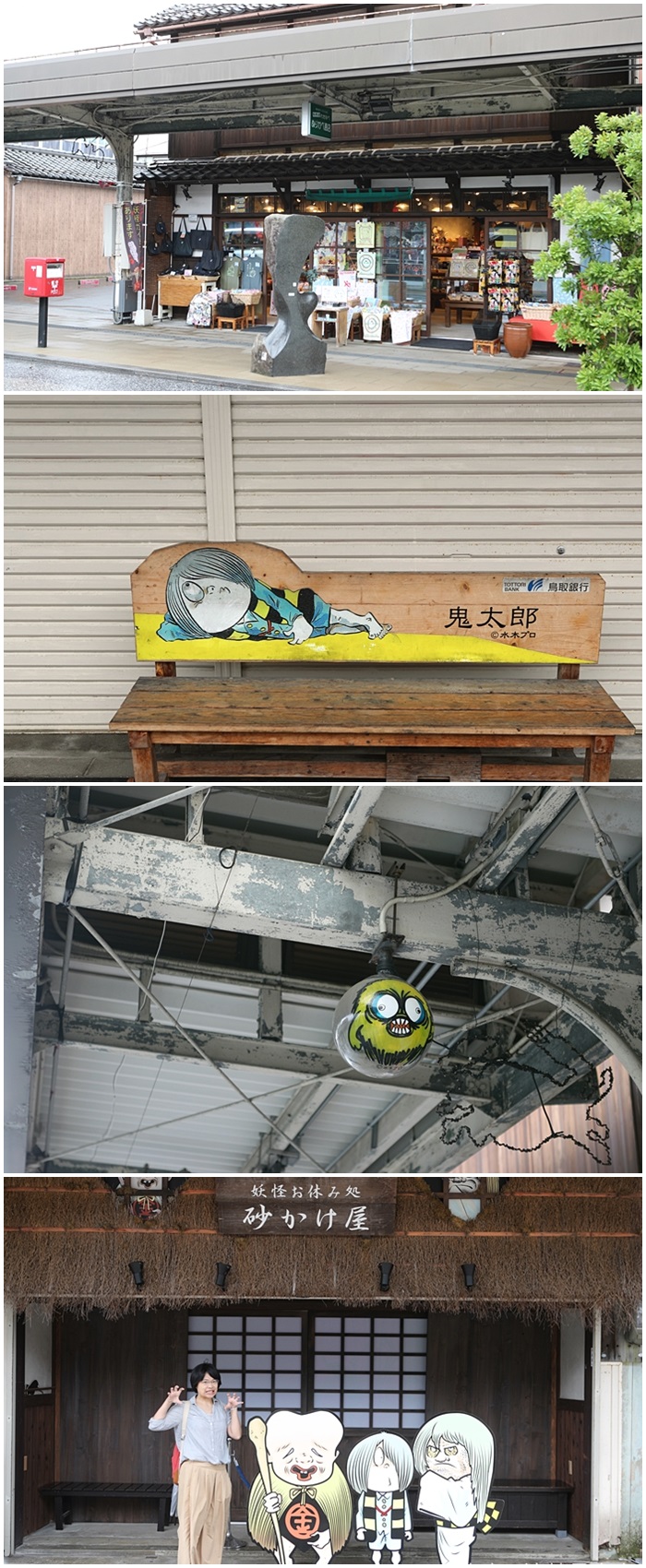 | 水木茂大道商店街的街道處處都有小細節可以看到鬼太郎的布置物,連長椅都是非常主題化,當然少不了鬼太郎裡面各個人物。 |
