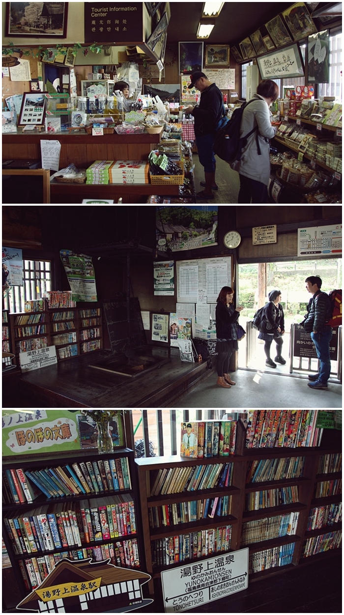 | 車站內同樣是古色古香,除了有一家老商店就在車站內營業,賣的商品非常多很好買,我每次來湯野上溫泉都會失控的狂買,這邊超多土產可以買的,一旁還有漫畫可以看,真的還滿有趣的。 |  |