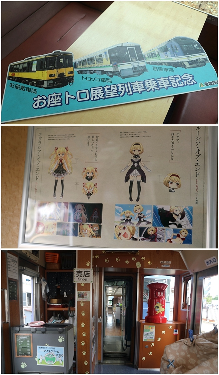 | 特色車廂通常在車上會有不同的設計跟主題,會津鐵道也有動漫人物的鐵道少女。 |  |