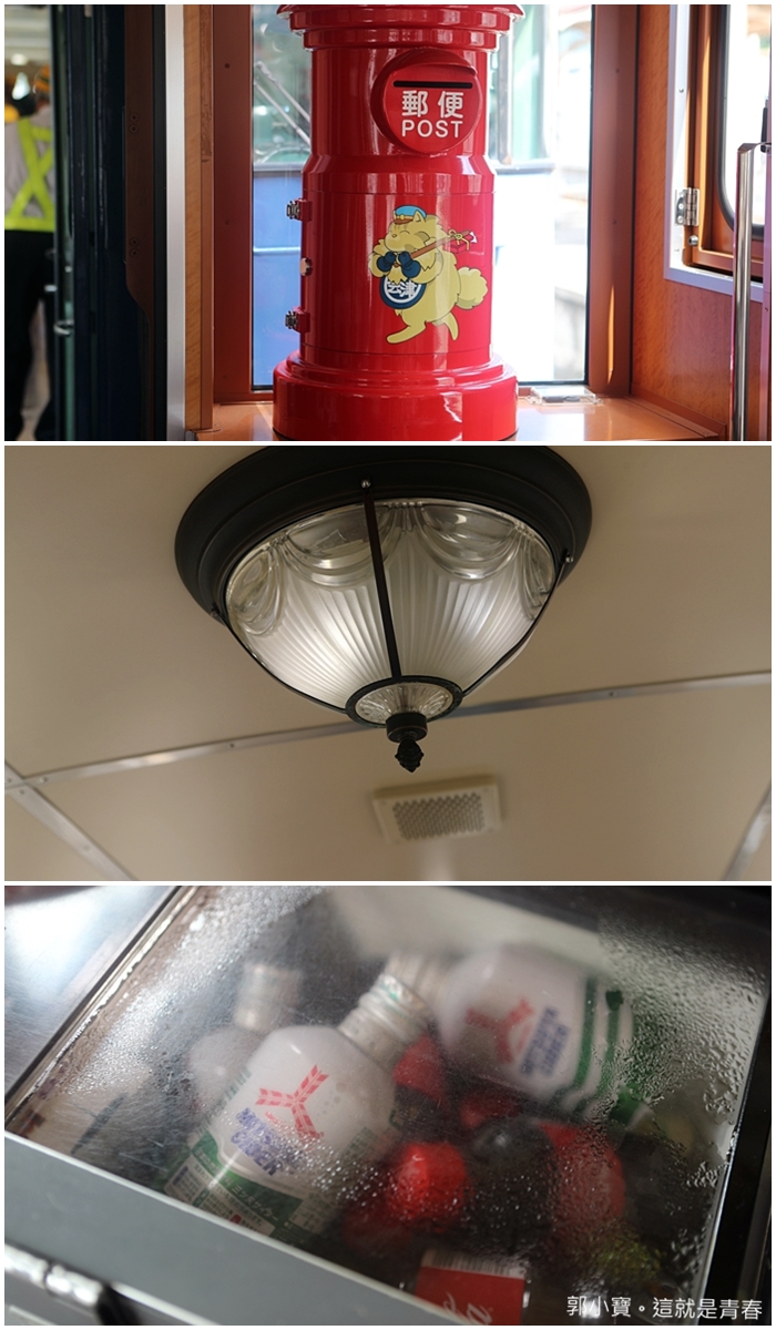 | 各式各樣的設計真的都很讓人喜愛,尤其車廂上的天花板的造型燈一整個就是濃濃的復古味道,車上的冷飲也都是在地商品及大眾飲料。 |  |
