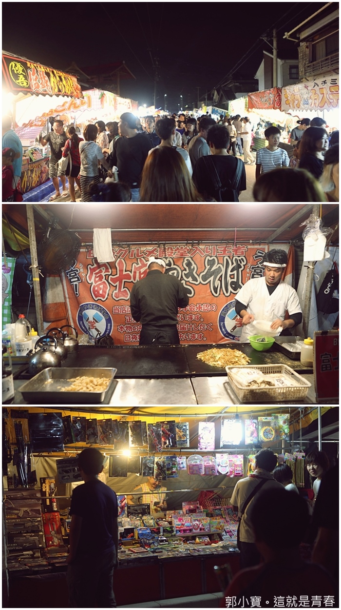 | 一走入祭典附近映入眼簾的就是台灣人最愛的夜市啦,這一條大街全部都封閉起來當成攤販大街,琳瑯滿目的攤販小吃真的超級熱鬧的,看得我每一種都想試試看,日本祭典的前一天晚上都固定會有宵祭,除了夜晚祭典的重點以外,對於遊客來說當然就是攤販大街了。 |