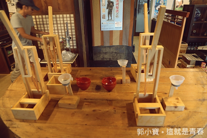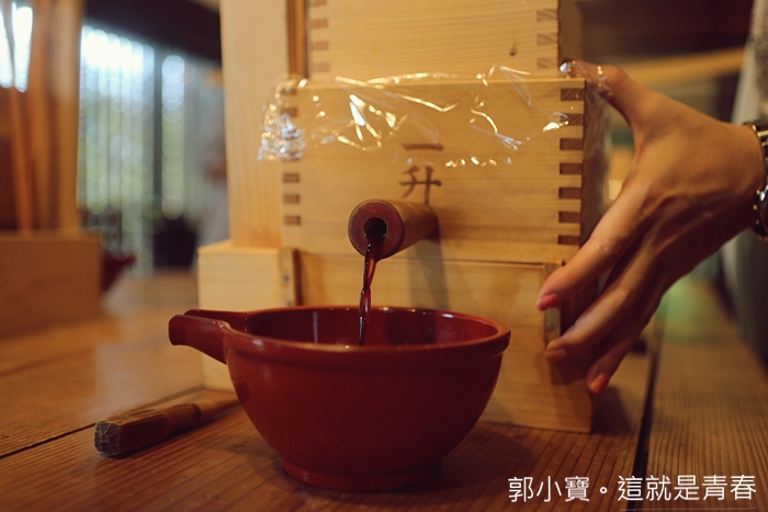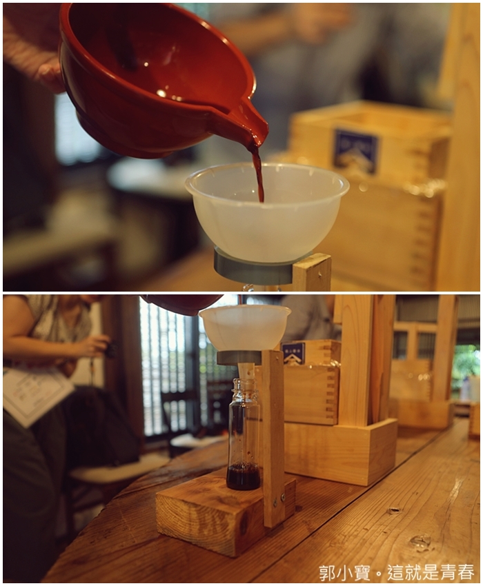 | 利用早期的木製榨汁工具用力往下壓的時候真的有股快感,拔掉木塞的時候就看到生醬油緩緩流出真的太有趣了,且流出醬油的時候真的可以聞到超濃郁的醬油香氣。 |