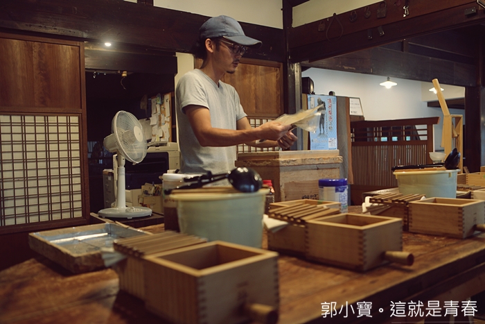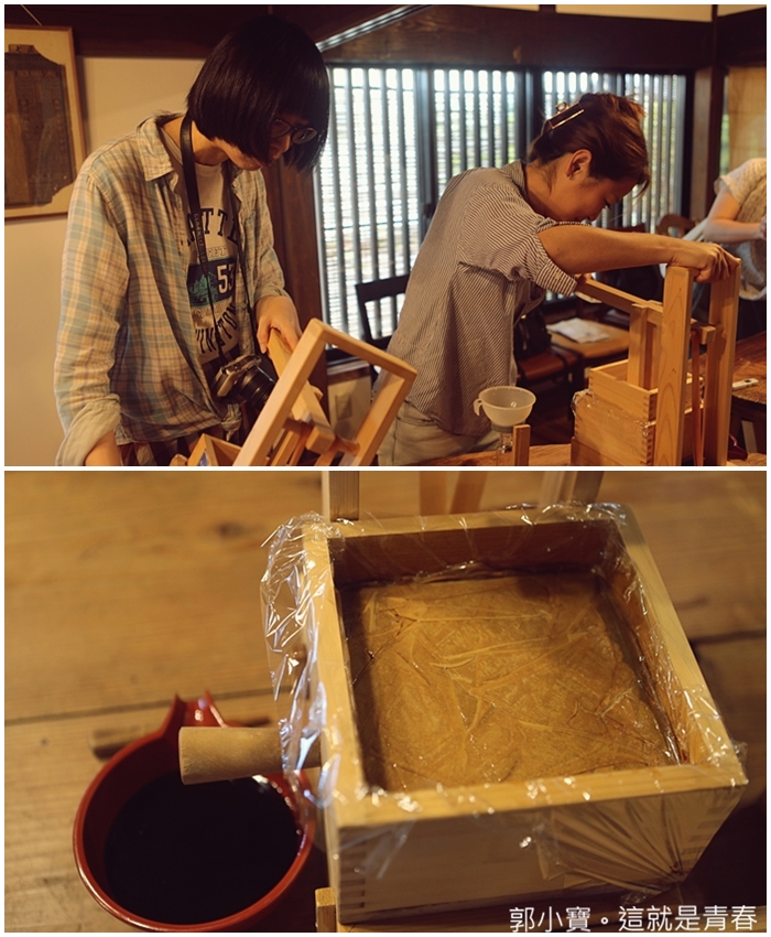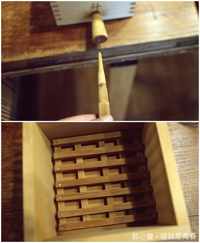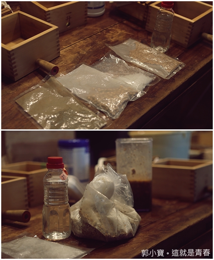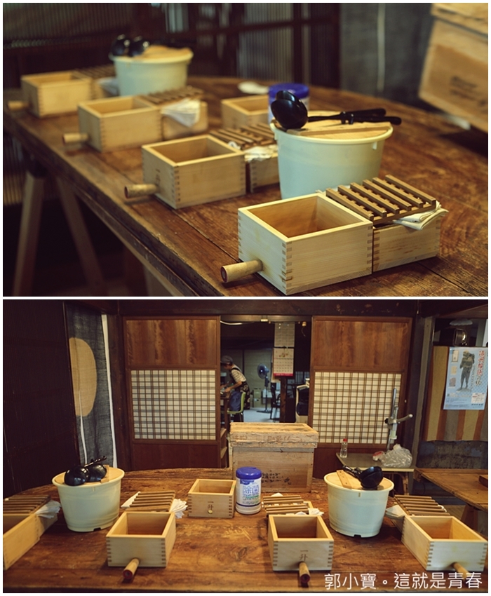 | 另一個桌子上放的是四個木盒,器具明治屋醬油工廠都會準備好,妳只要人道就可以製作屬於自己的醬油了。 |