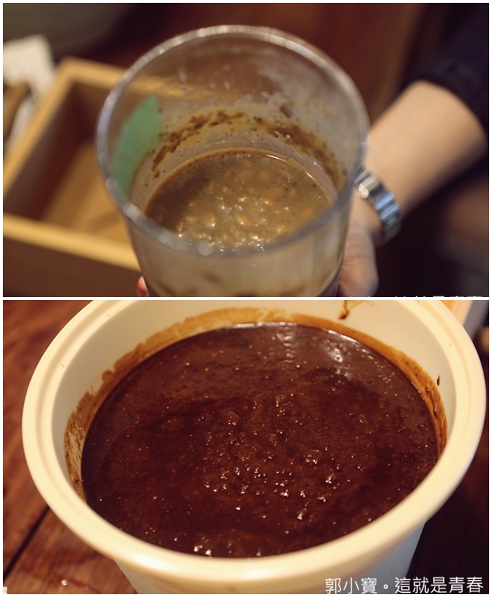 | 大火手忙腳亂的榨汁真的還滿有趣的,醬油都會先流到碗裡面,醬汁最主要多寡是取決妳的醬泥多不多跟壓榨的力道,但是老闆基本上都叫我們不用壓太大力,帶點力度往下壓即可。 |