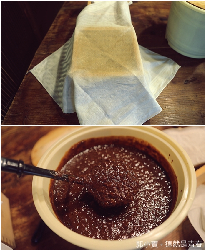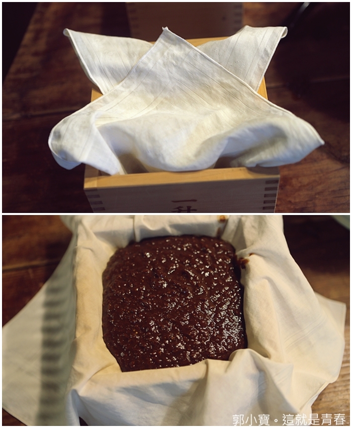 | 將醬泥放到木盒中再對角的蓋上白布,再繼續放上白目撈上一杓醬泥,這樣重複三次。 |