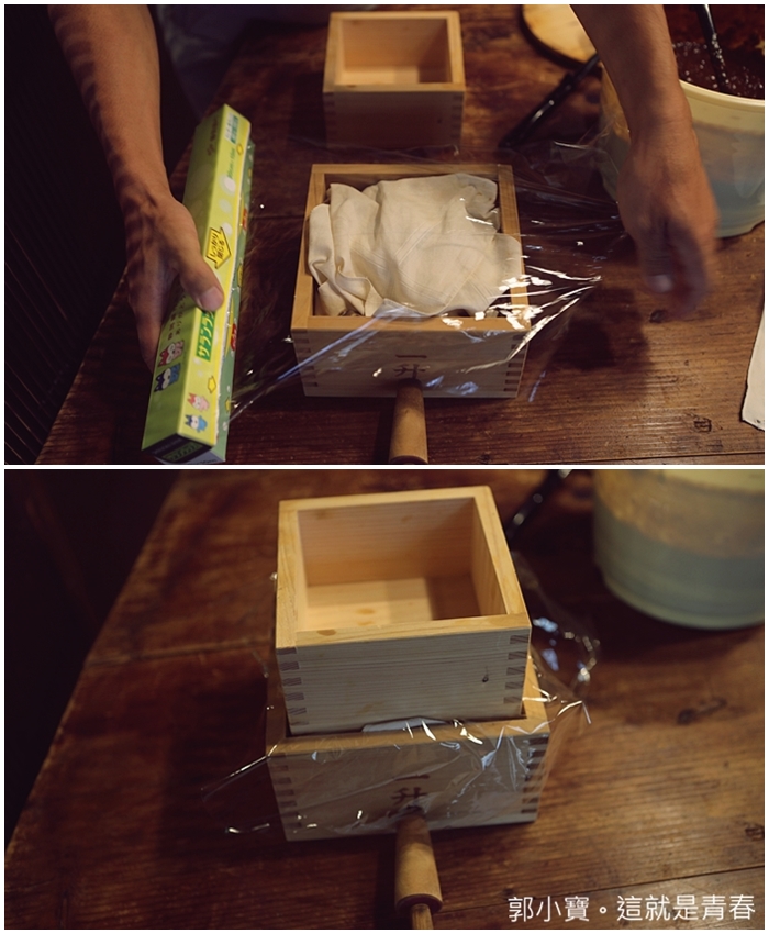 | 三次之後就將木盒表面蓋上一層保鮮膜,保鮮膜可能是近代才使用,其實我有點好奇那以前沒有保鮮膜的時代是使用什麼避免醬泥與醬汁從旁邊流出。 |