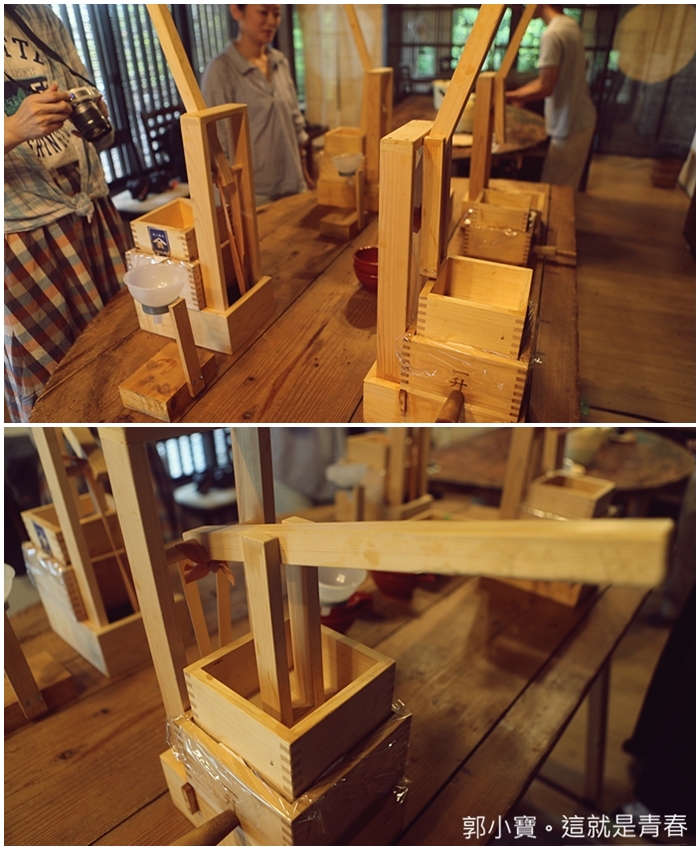 | 手作醬油體驗一組四人為主,不足四人也可以啦,桌上的木製榨汁工具真的讓我超有興趣的,看起來很像很厲害的感覺。 |