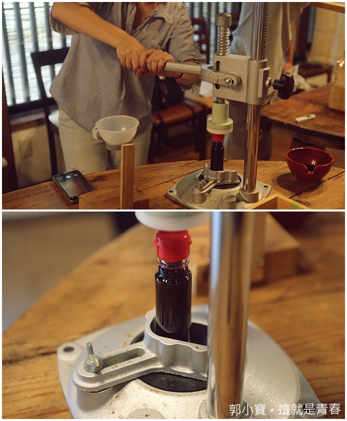 | 然後小老闆就默默拿出封蓋機給我們,其實步驟跟動作都很簡單,上蓋再按壓機器就會將封蓋緊密上牢了。 |