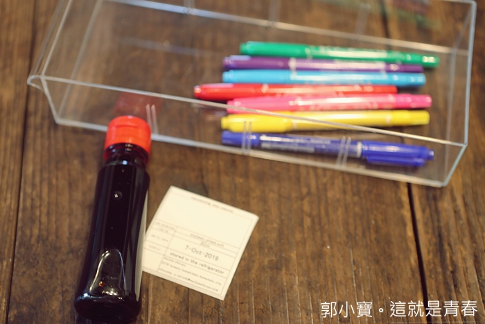 | 接下來再換到一旁的桌子,準備稍微彩繪一下自己的醬油了,老闆會準備等等要貼在醬油瓶上的貼紙跟彩繪筆讓大家隨意創作。 |
