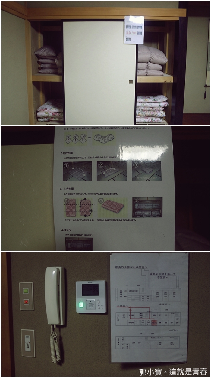 | 棉被、枕頭跟地墊都在櫥櫃裡面,需要自己鋪床,早上醒來的時候也需要自己打掃整理在放進櫥櫃裡面,把睡過的床單跟枕套放在門口即可,會有僧人來收去洗,如果不會鋪地墊跟棉被的話,櫥櫃上有圖示教學,房間有空調冷氣,這一點是我唯一欣慰的,我超擔心沒有冷氣會很熱。 |