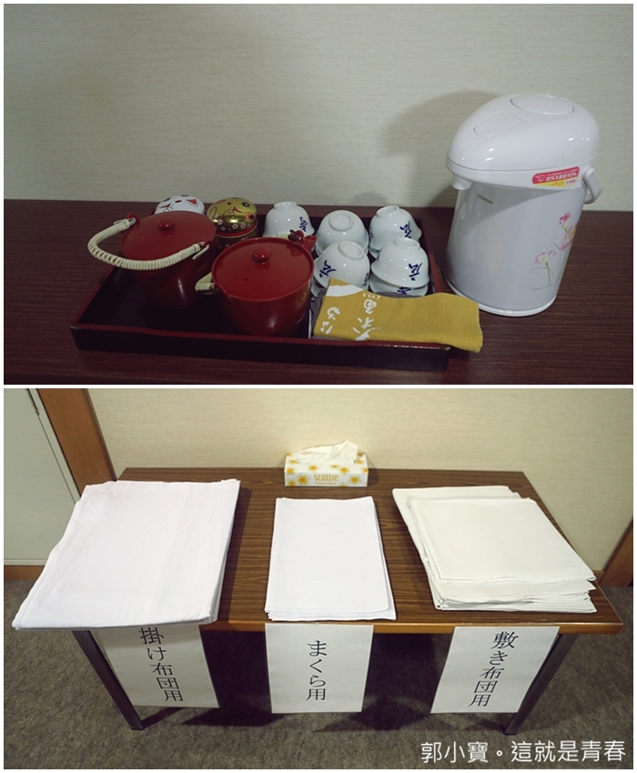 | 茶水、茶葉、茶壺都在走廊上,需要的可以自取,還有床單、被套跟枕套也都在走廊。 |