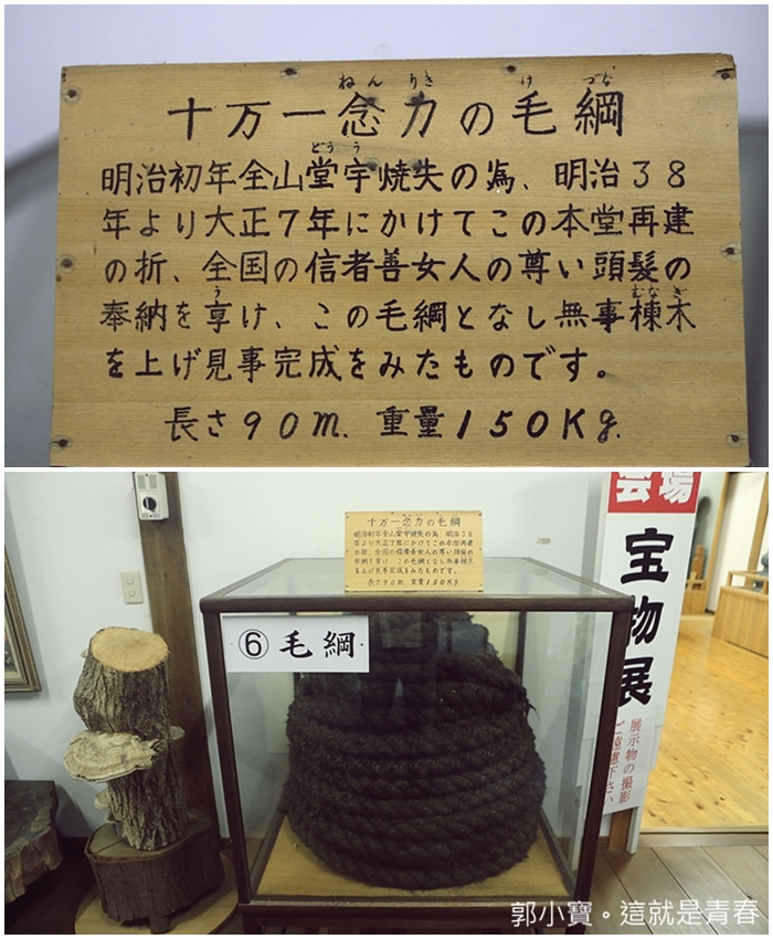 | 但是讓我最驚訝的就是寶物殿外的這很像麻繩的東西,這是某年方廣寺火災後要重建,當地的女人捐獻自己的頭髮編織而成的髮繩,為了吊掛起重建寺廟的梁柱,這樣多少人的頭髮才能編得那麼粗又那麼長的髮繩啊!!!! |