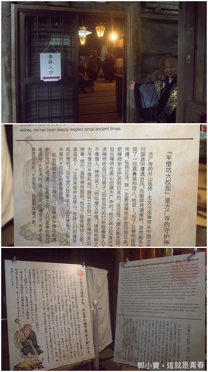 | 跟著師傅來到上早課的地方,殿內還有一個立招有方廣寺的中文介紹。 |