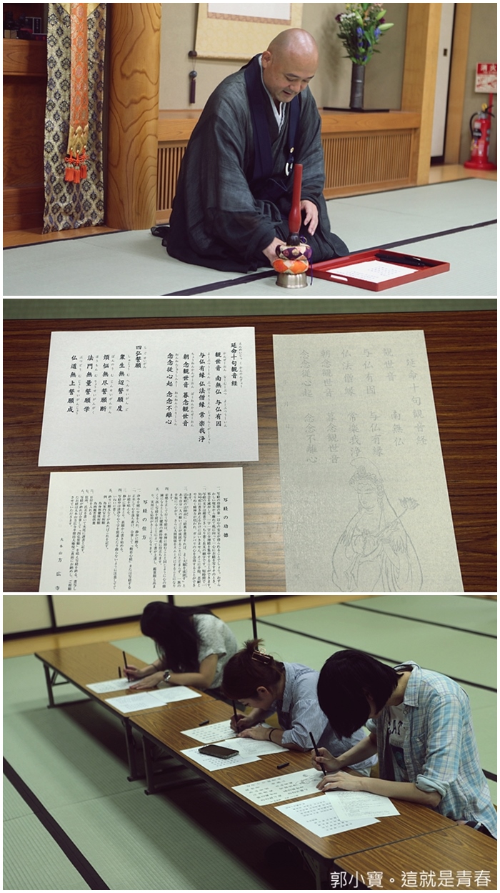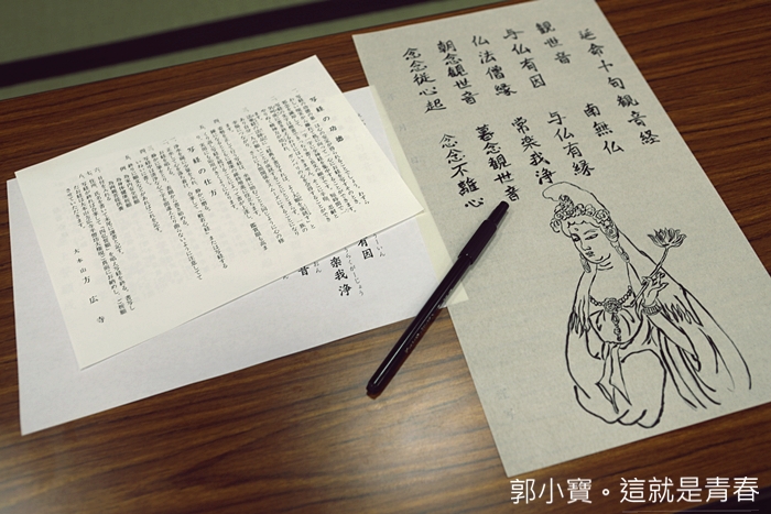 | 上完早課接下來就是要抄寫經書了,我還滿喜歡這個功課的,其實就是描繪觀音像跟經文,不過真的可以完全靜下心來聚精會神的抄寫,一筆一劃慢慢的描繪,等寫完的時候會有一股恍然大悟的感覺,我好像很久沒有這麼專注在一件事上了。 |