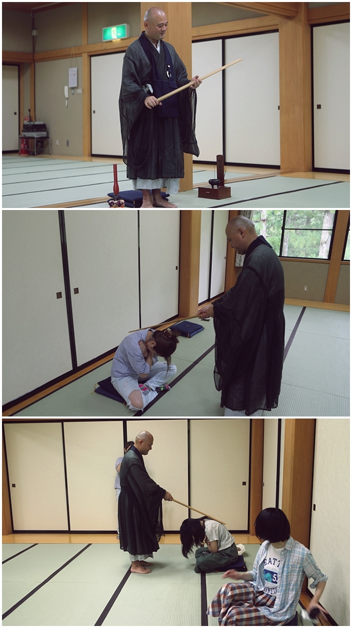 | 就像看一休和尚那樣,如果友人不專心還是打瞌睡,師傅就會拿棒子打或是矯正妳的姿勢,等到整個禪坐完畢,師傅也會用木板棒各敲一下妳的雙臂,記取師傅的教悔跟此刻的寧靜。 |