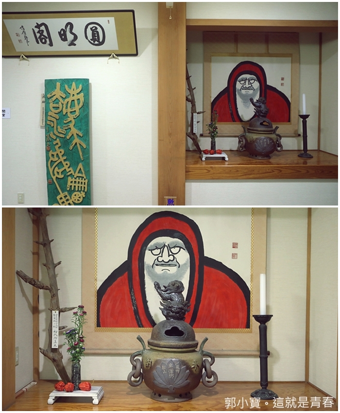| 住宿的地點打掃得很乾淨,一進門就會看到達摩像,日本的和尚其實是一種職業,可以娶妻生,也可以喝酒吃肉,但是日本佛教的流派很多,有些也是嚴手中國流傳過來的戒律,不食暈食。 |