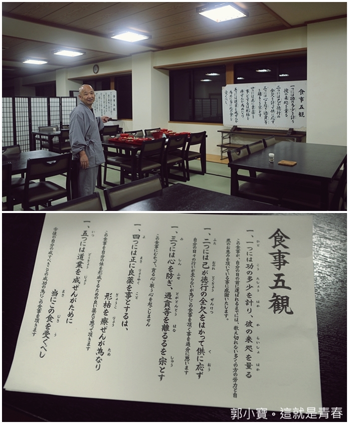 | 師傅先趕緊帶我們去用膳,因為時間真的很晚了,廚房可能也等我們很久了,吃飯前都要先讀一下食事五觀,基本上吃飯前就是先感恩一堆就是了。 |