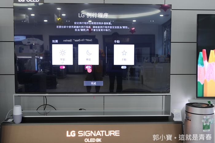 | 另外還有LG例行程序,設定好後每天早上喊起床的時候,他就能自動幫你打開設定好的迎接早晨任何IOT家電,我家大概就是一喊早安就會自動開啟我的窗簾、音響、空氣清淨機等等商品,當你晚上要睡覺喊一聲晚安,就可以關閉IOT家電,也可以開啟清淨機,非常方便!!! |