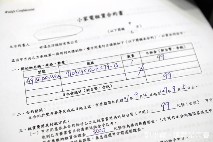 | 承租人只要簽名付錢就好了,簽兩個空白處跟留下手機號碼,不管任何家電都是一天99元,例如我是9/4號晚上大約7點左右去租,店員說我只要9/5關門以前拿去還即可。 |