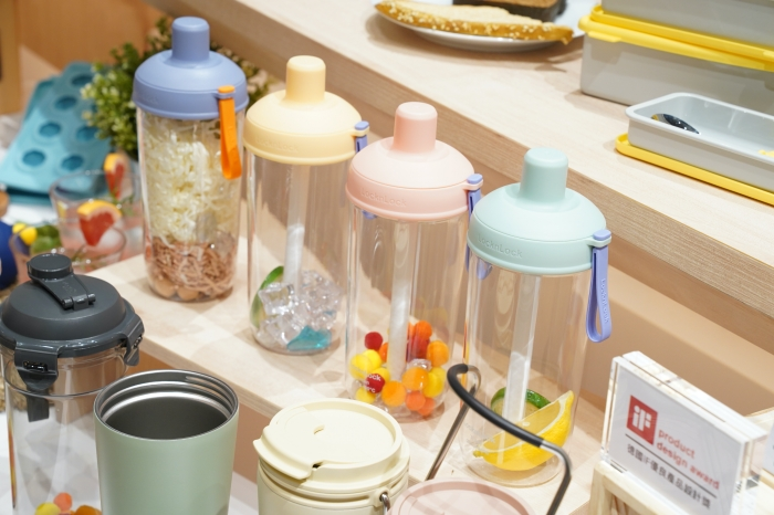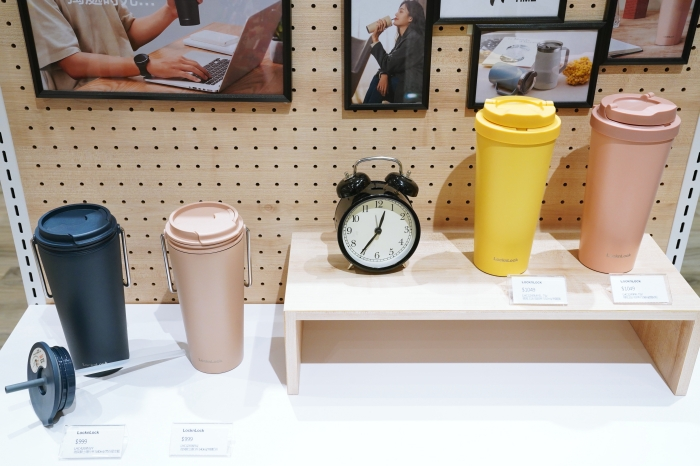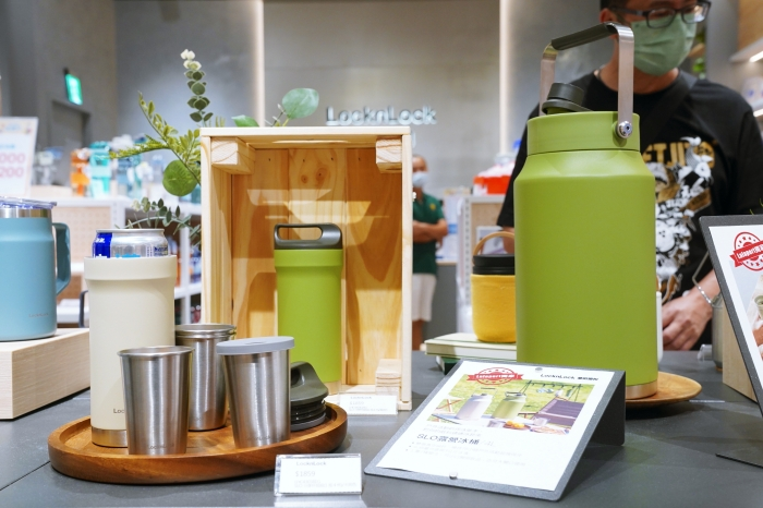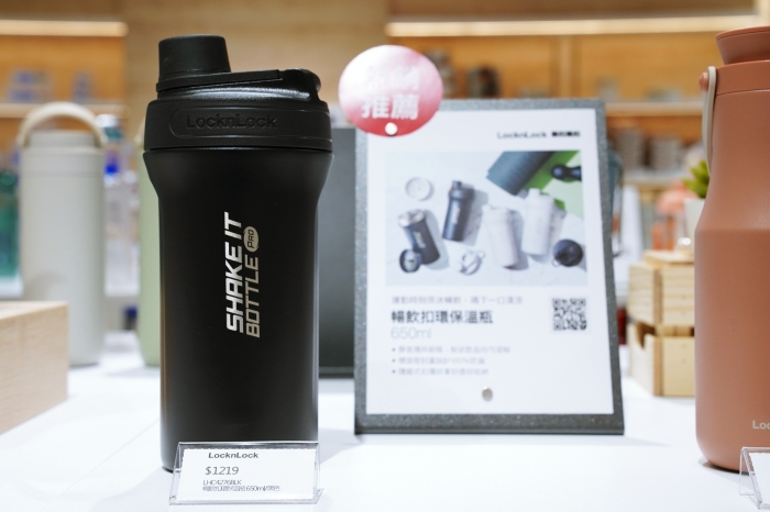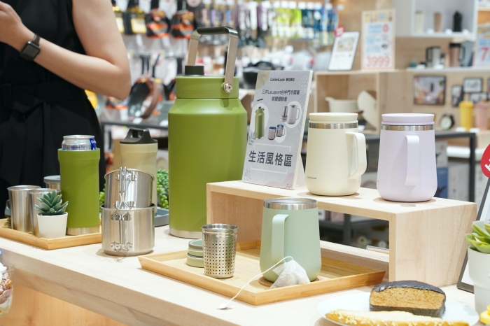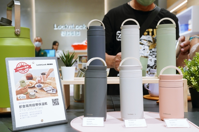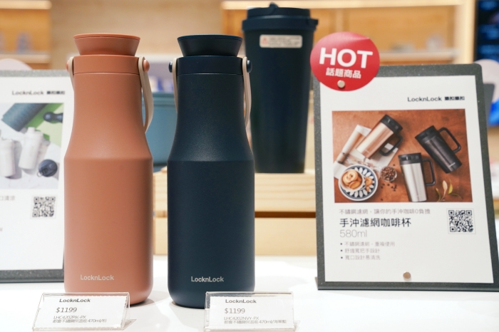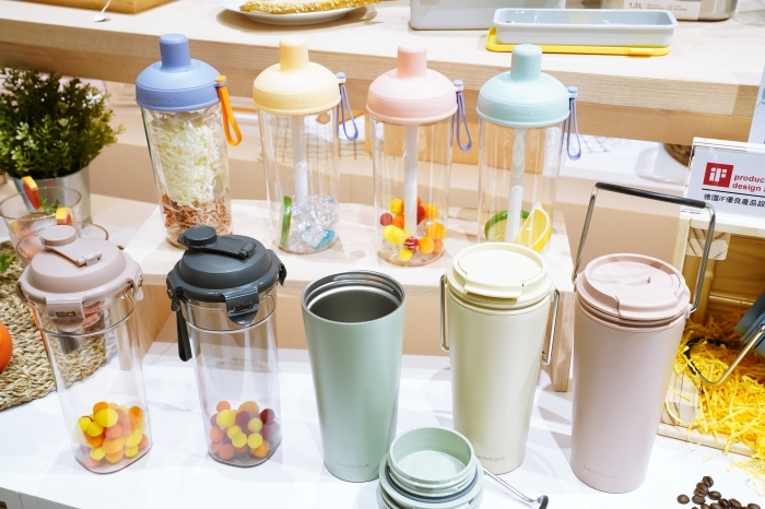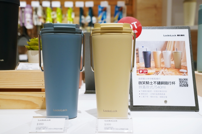 話題商品區Tritan珍奶杯、嚼對搖搖吸管杯、微笑騎士不鏽鋼隨行杯都是樂扣樂扣的熱銷杯款。