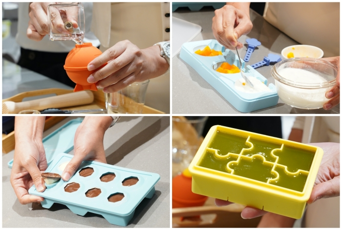 夏天必備的造型矽膠製冰盒有火箭造型、鑽石造型、拼圖造型、炸彈造型的冰球,彈性好,稍微施力就輕鬆脫模,此外材質使用嬰兒奶嘴矽膠的無毒材質,可以放心做點心給小朋友吃。