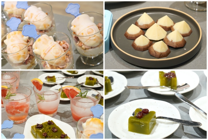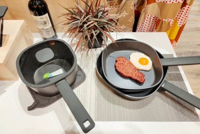 居家料理區陳設多款Square厚立方可堆疊鑄造IH不沾鍋具,有單柄、雙耳湯鍋、平煎鍋,共同特點是方形設計來增加32%可用容量,這款鍋具有良好的導熱性與均勻度,增進烹飪效率,也方便清潔、收納。