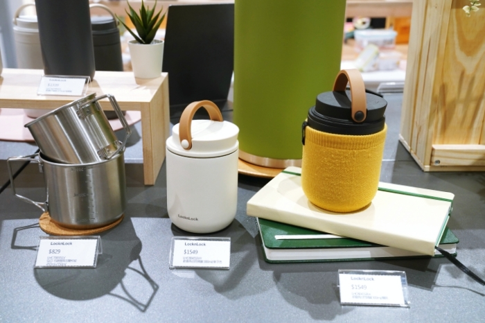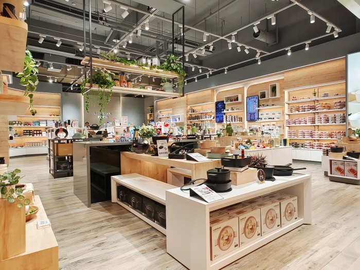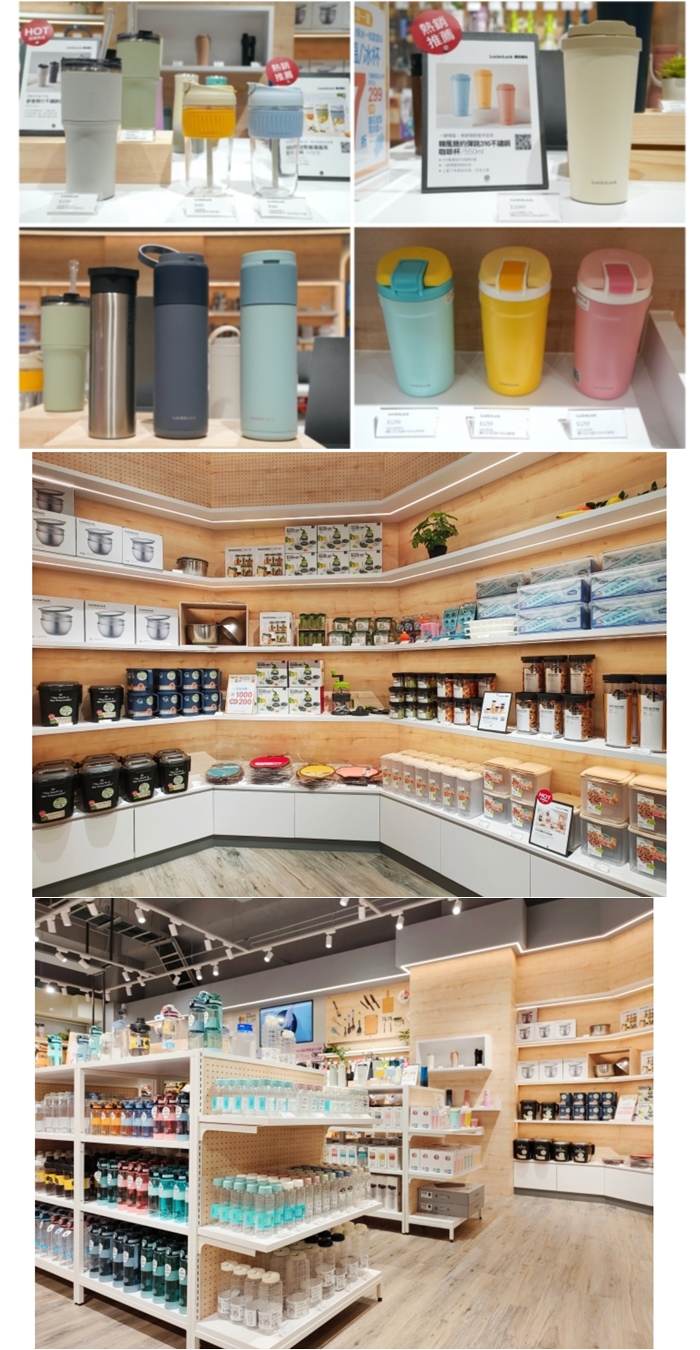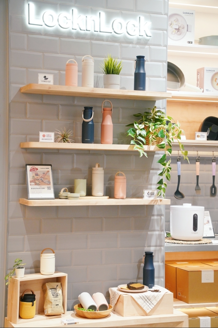 | 樂扣樂扣三井LaLaport台中門市明亮的燈光、時尚色調、舒適的購物環境,設計居家感的暖色原木讓人在選購時,都能想像到物品擺放在家中的樣子, 天花板冷灰色系搭配鐵件裝飾有點輕工業風的感覺。 |