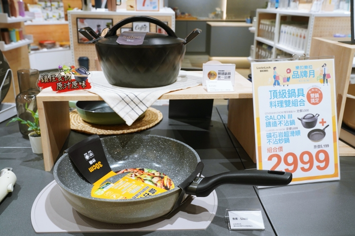 SALON第三代鑄造不沾鍋格紋外觀充滿時尚感,礦石岩超滑順不沾炒鍋人體工學把手設計好拿不燙手,而且是由陶瓷塗層製成,不僅耐刮使用起來也格外安心,兩種都是呈現頂級工藝技術的鍋款,一組組合價三千有找。