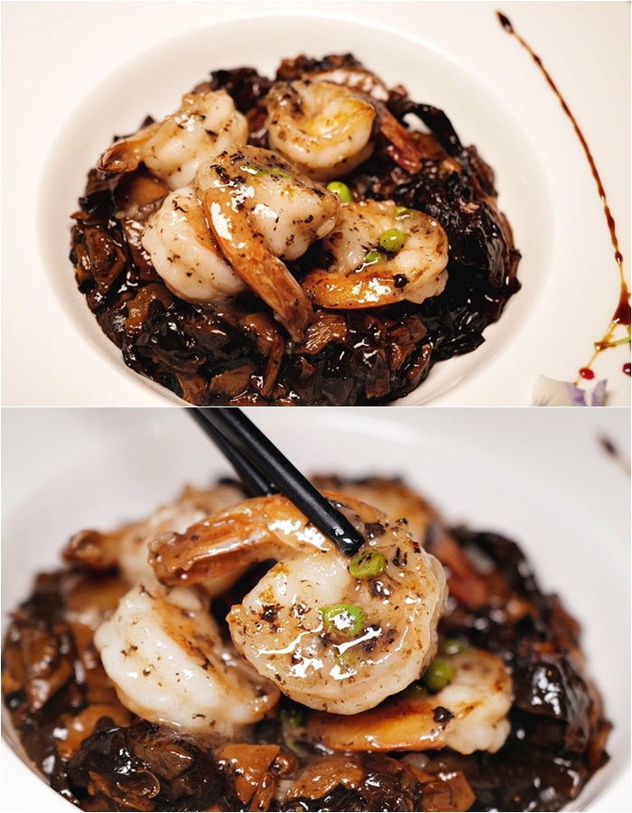 | 老婆選的主餐式菌皇黑松露蝦球,賣相還挺不錯的,主要是一端上來就可以聞到濃郁的松露香氣,搭配蝦肉彈牙的大蝦,一口吃下非常滿意,底下鋪墊的好像是巴西蘑菇,搭配特製的黑松露醬,非常不錯。 |