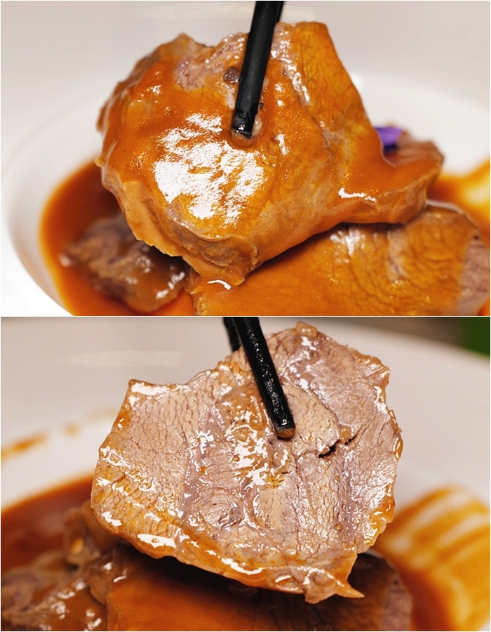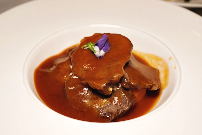 | 我點的就是海龍王水族餐廳的招牌主菜,紅酒燴澳洲牛面頰看起來非常美味,牛面頰的數量滿多的,紅酒醬的香氣也非常濃郁,緊緊的巴在牛面頰上,入口的迷人淡雅香氣跟牛面頰肉的軟嫩搭配的恰到好處。 |