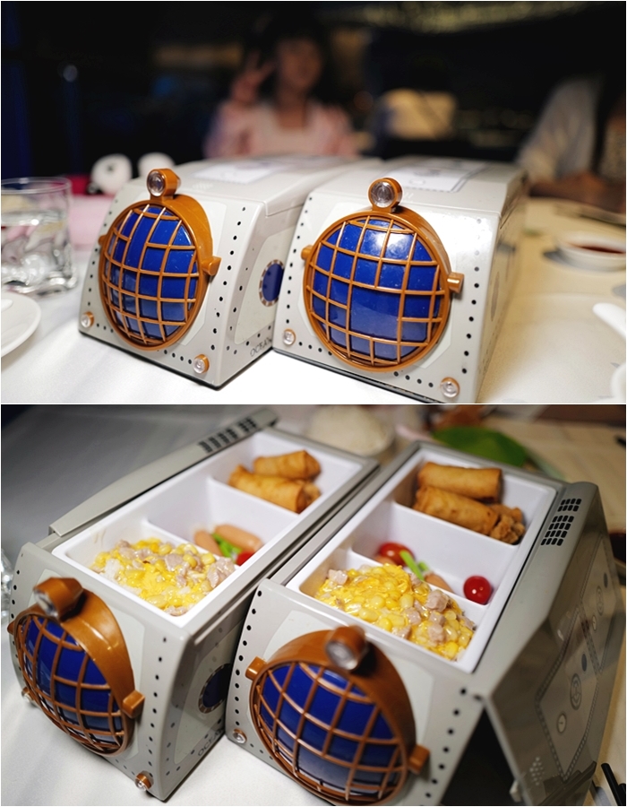 | 海洋公園內的餐廳每一家都有兒童餐,餐盒是海洋公園最有名的海洋列車造型,打開蓋子裡面分有三格。 |