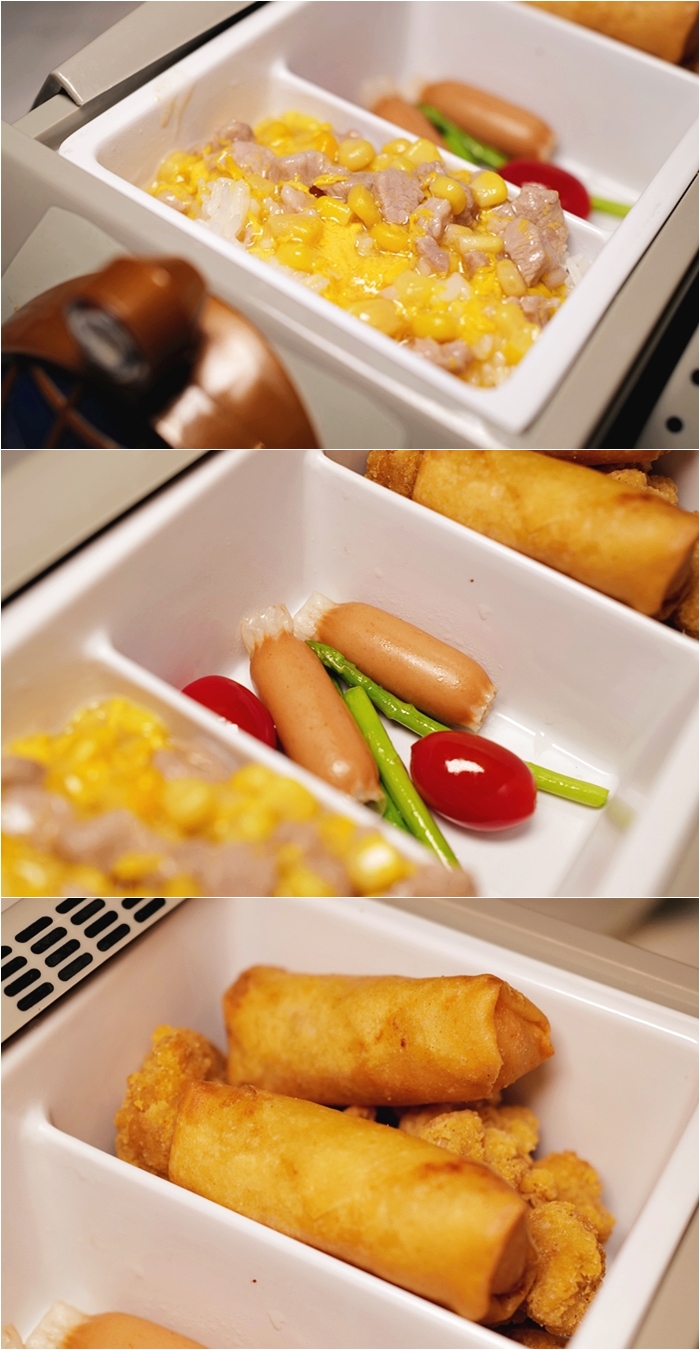 | 全部都是小朋友喜歡的食物,白飯上的玉米粒跟甜甜玉米汁也可以讓小朋友大口吃飯。 |