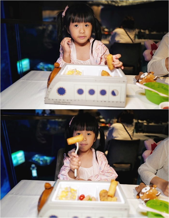 | 非常推薦來香港海洋公園一定要造訪海龍王餐廳,如果有帶小朋友來,根本就是小朋友的快樂餐廳,除了可以坐在水族箱旁根魚兒一起共食以外,還有美味的兒童餐,另外結束還有代幣可以玩扭蛋跟夾娃娃,一整套下來讓大人小孩都開心至極!!! |