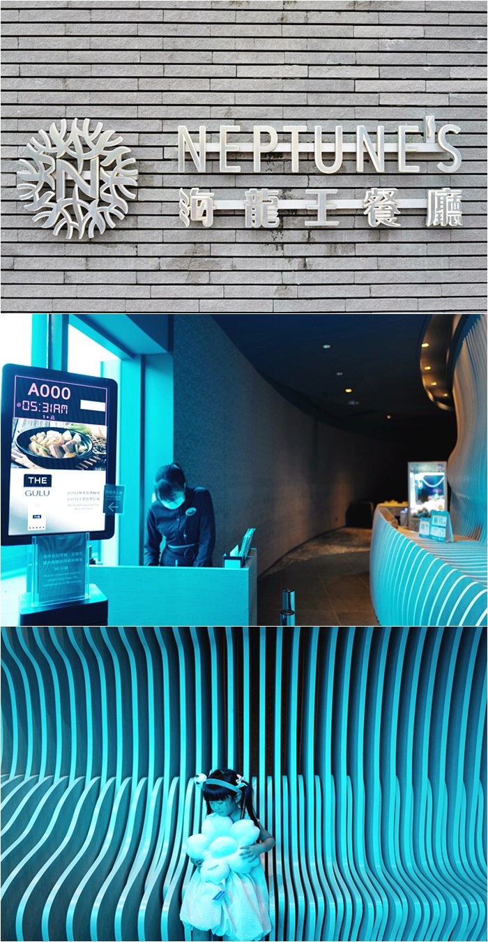 | 建議大家可以先訂位,尤其是假日幾乎座無虛席,沒有訂位的話需要現場候味,入口櫃檯的玻璃窗面貼上藍色玻璃紙,彷彿置身在海洋中的感覺,女兒也一整個超期待! |