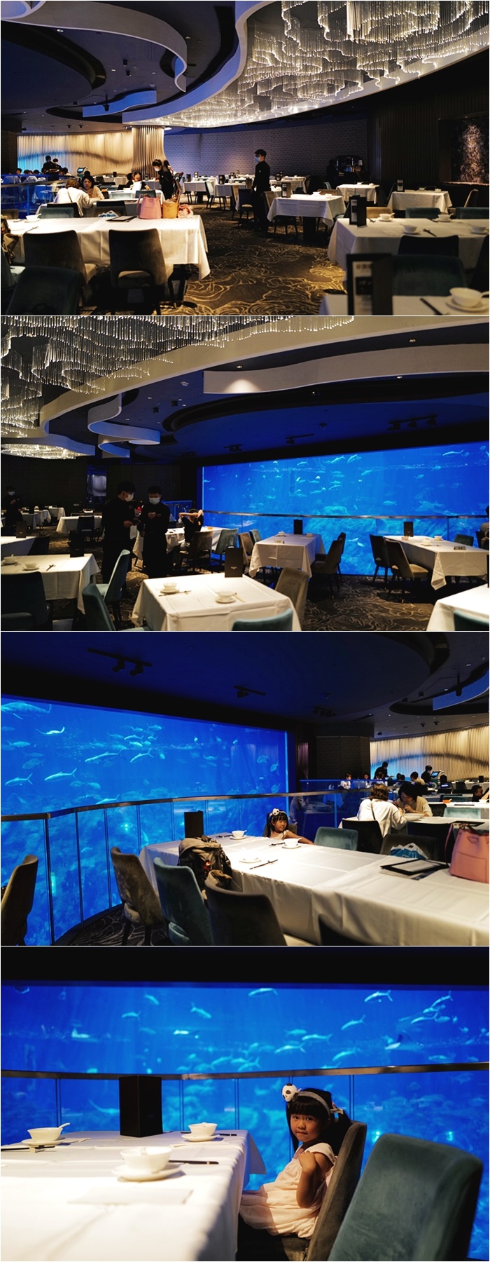 | 進入室內更是讓人驚豔,流星般的吊燈垂落也太有氣氛了,不只親子家庭適合,就連情侶約會用餐也很浪漫,一旁就是超大的水族箱,可以看到各式各樣的魚類在你身邊遨遊,真的很特別的用餐體驗,尤其是小朋友一整個開心到爆。 |