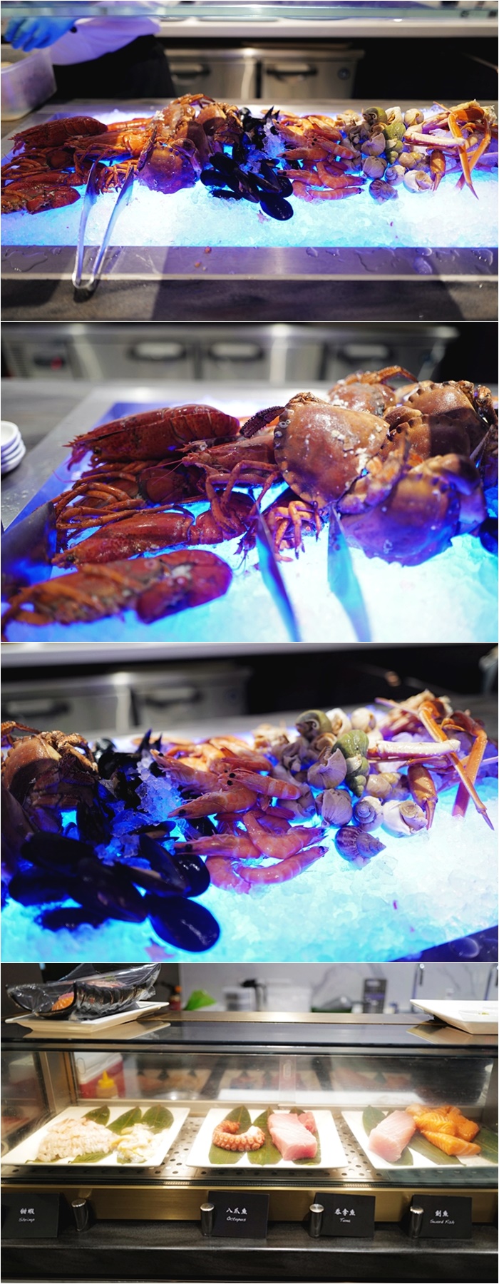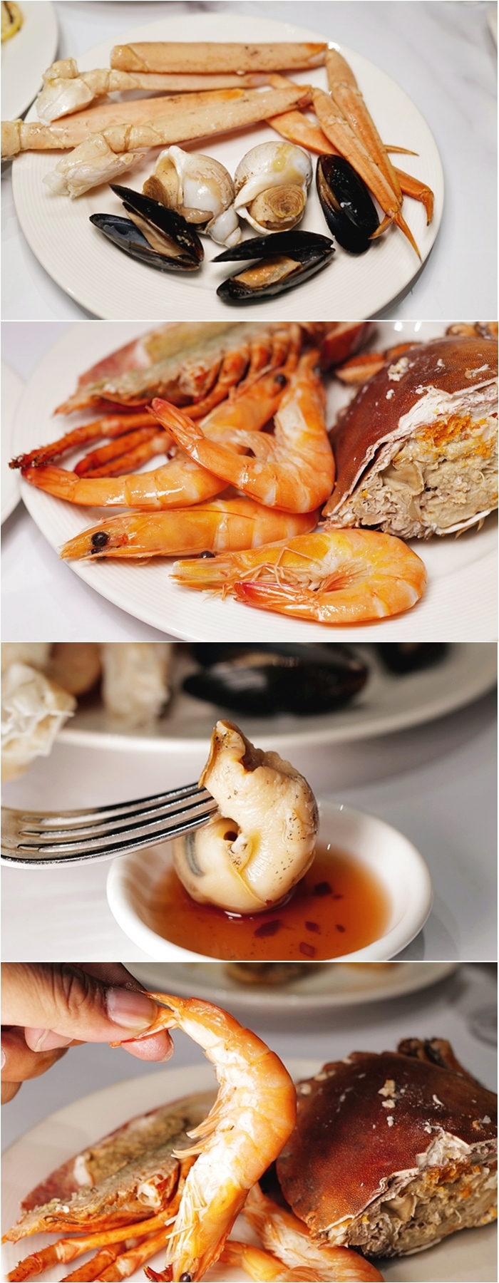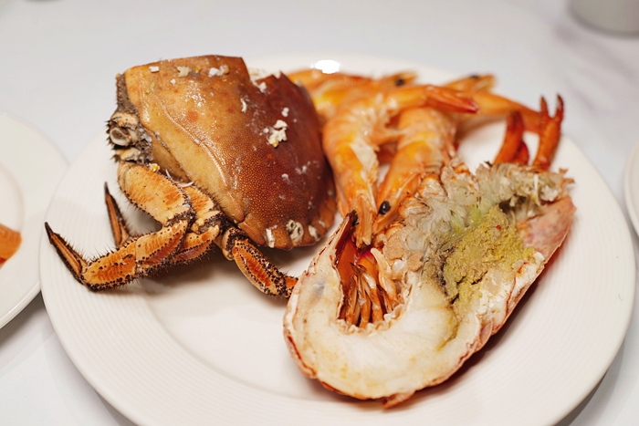 重點的海鮮檯面非常豐富,且餐廳補貨補的很快,不怕你吃,一少就補的滿滿的,誠意十足,幾乎沒有看到檯面空過,除了龍蝦、螃蟹、貝類、螺等等還有生魚片! |