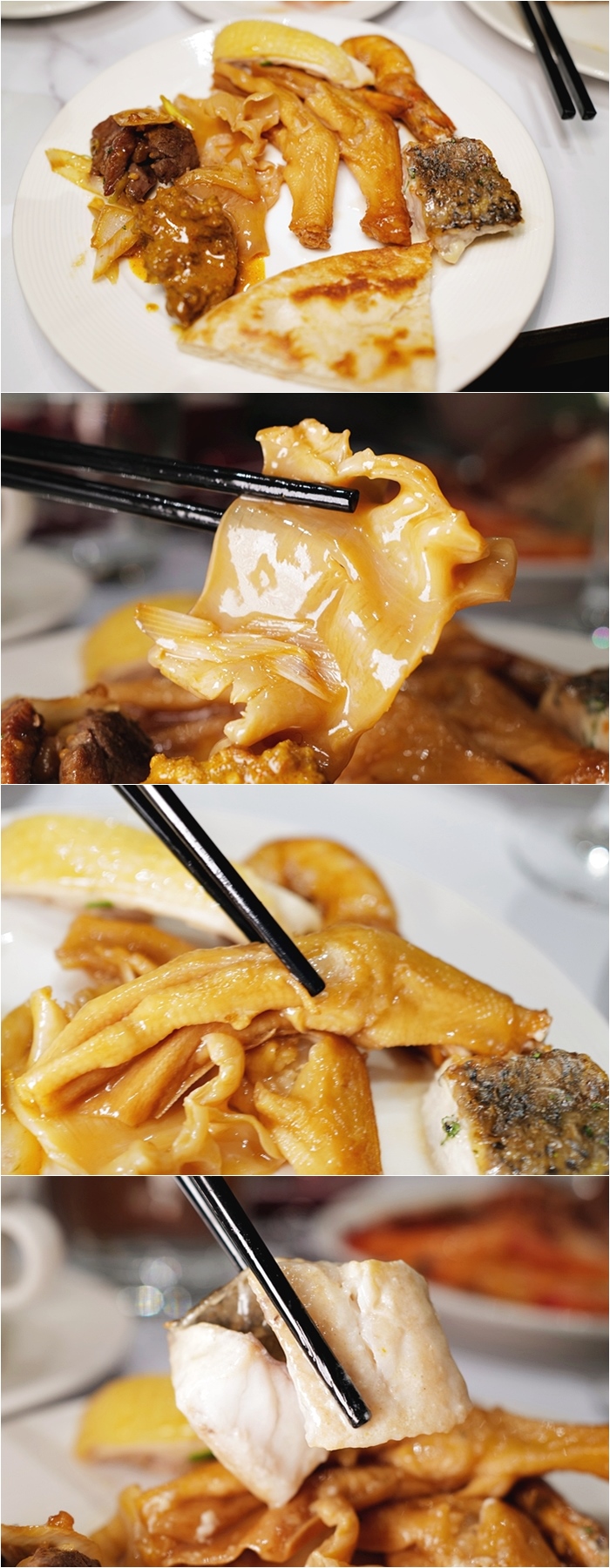 一路看過去,要價不斐的花膠、蟹蓋、蝦鉗、鵝掌、石斑魚、鮑魚等等隨便一樣都可以拿到台灣的自助餐當宣傳主菜,真的太豪邁了!!!! |