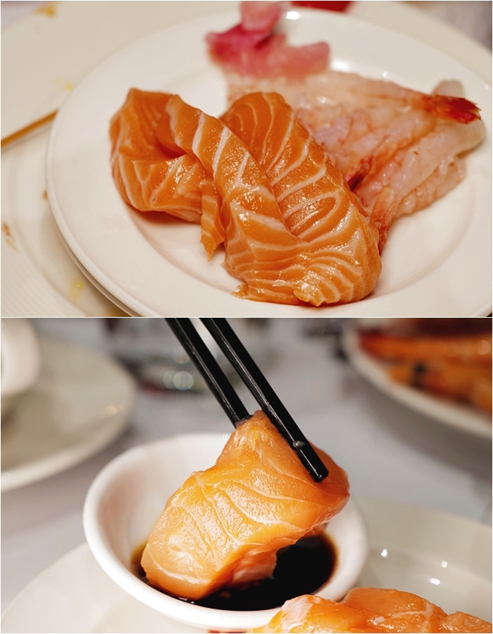 | 花膠近年來的價格攀升的超高,直接當吃到飽的熱菜真的太霸氣,狂夾花膠來補充一下膠原蛋白,還有鵝掌也超好吃,另外還有各種魚片也吃到超爽的,更別說蟹蓋跟鮑魚我更是吃了好幾盤,肚子光是塞這些高檔食材都塞不完了。 |