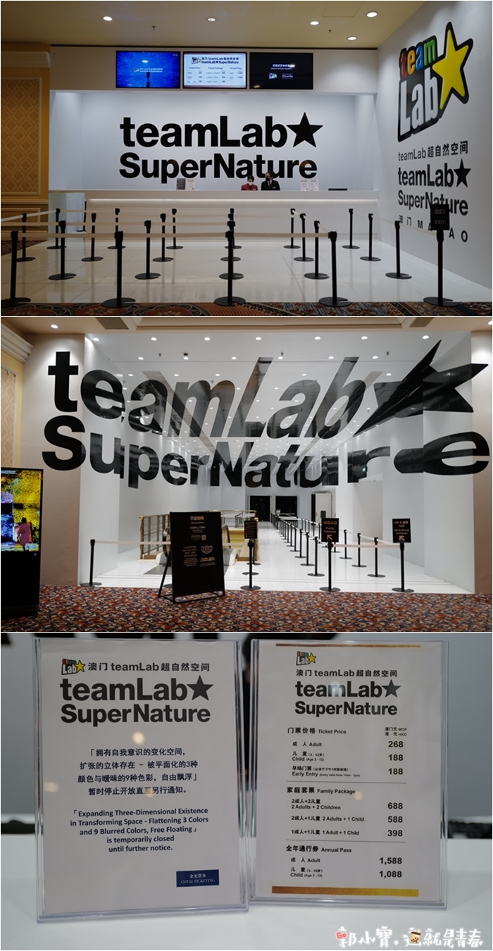 如果要在澳門選一個全家大小都會很喜歡的景點,那我基本上一定會推薦澳門teamLab超自然空間,尤其澳門teamLab超自然空間經過2023年的擴大增設改版後,可看度一整個破表,甚至在我心裡面已經超越東京豐洲teamLab超自然空間,唯一的差別在於水的部分,澳門teamLab超自然空間直接蓋在澳門威尼斯人酒店裡面,沿著路標走就可以輕鬆找到,購票櫃台動線非常清楚,假日的時候人潮非常多,建議可以先上網訂票,因為人潮一定爆滿就會控管人流。