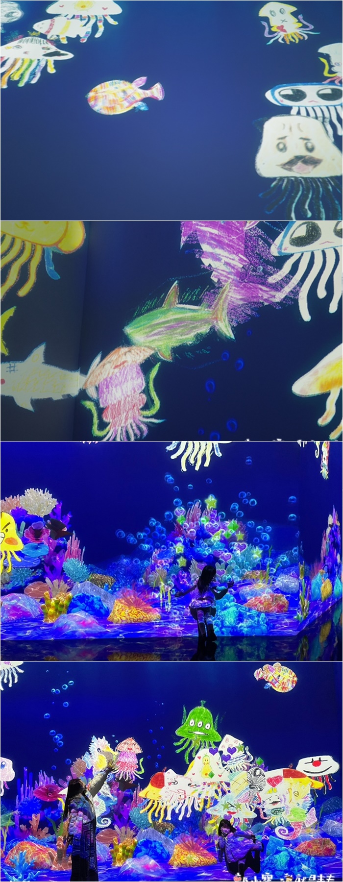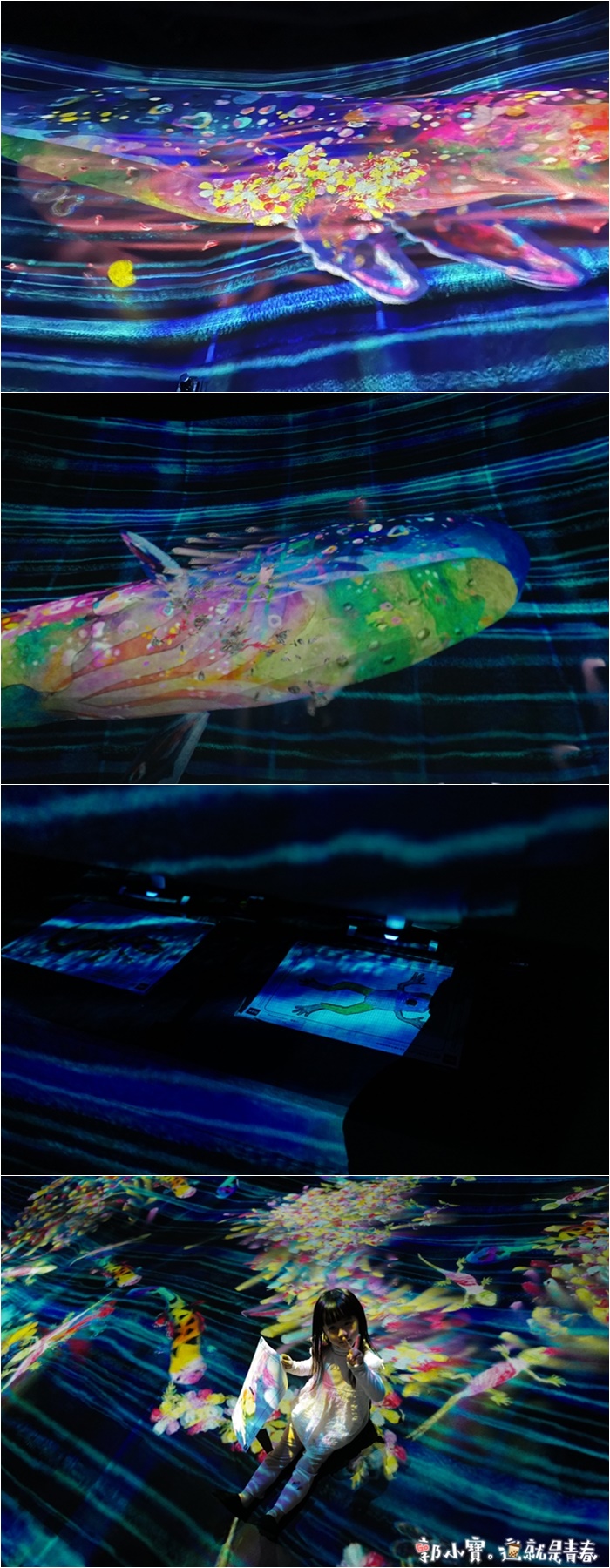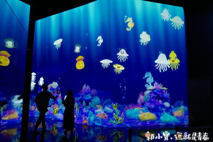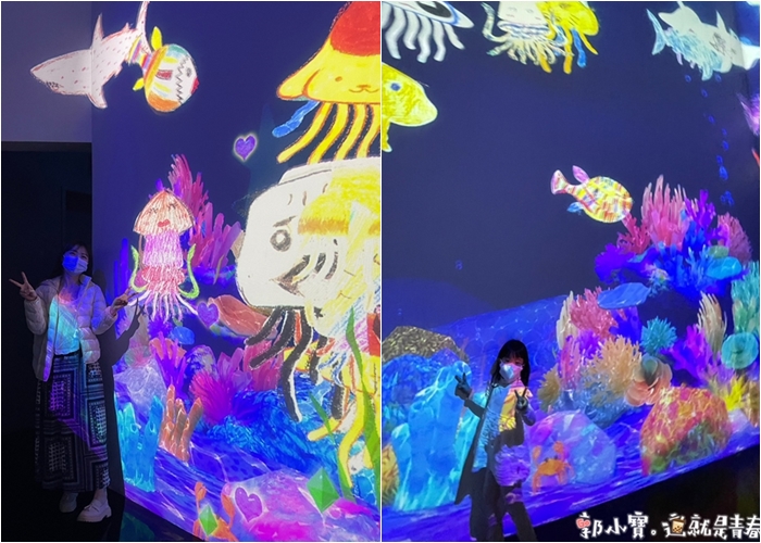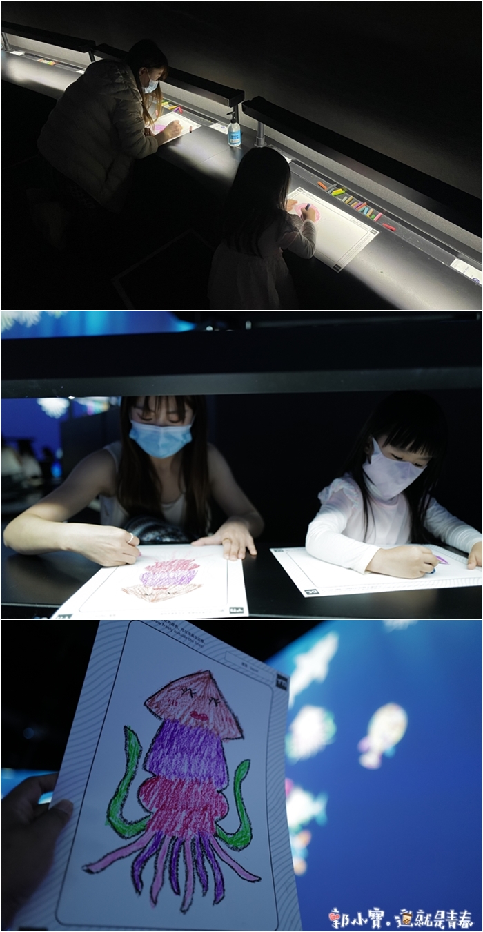 | 一樣是互動式體驗的彩繪,這次全部都是海底生物,且這投影背板也是互動的,可以輕輕的拍打達到互動的效果,尤其是有看到寶藏箱可以輕拍,就會開出寶藏。 |