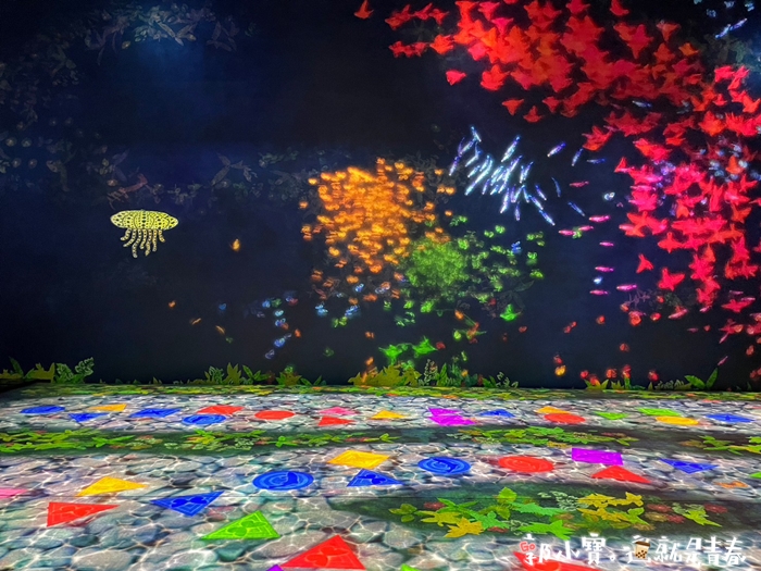 | 接著又轉到旁邊的空間,這邊的空間則是地上的互動體驗,同樣呈現著五顏六色的投射空間,對於女生來說都是很好拍網美照的地方。 |