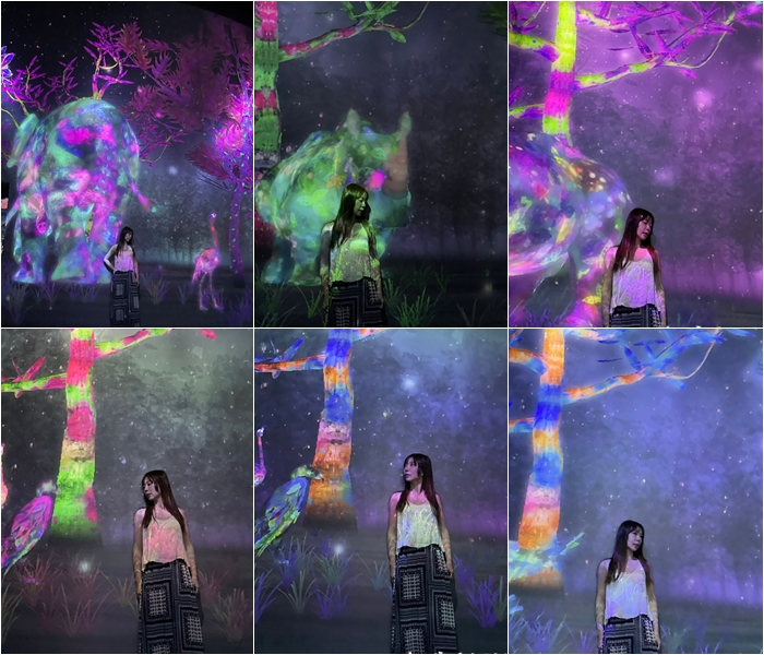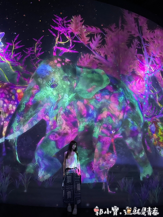 | 滑梯旁就是老婆很愛的迷幻森林,夢幻的背板動畫配色太吸引人了,森林裡面會有不同的大型動物走動,尤其是大象真的太夢幻,靠牆拍真的可以拍得美輪美奐的,澳門的teamLab超自然空間主要的是呈現絢爛的繽紛世界。 |
