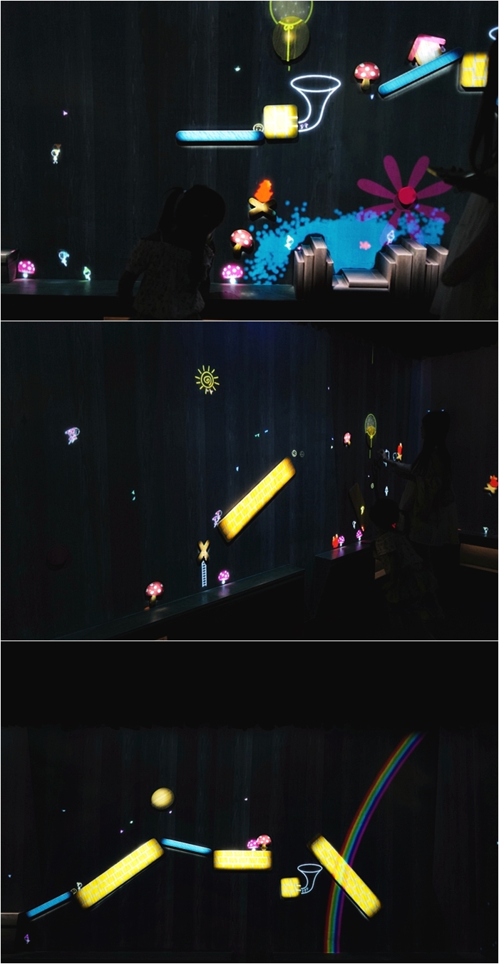 | 接著就是小朋友最愛的草原空間,翠綠的草地投影加上朵朵鮮花,一整個就是小朋友的最愛,因為這邊排隊還可以溜滑梯,一整面的大斜坡,歡樂的笑聲此起彼落。 |