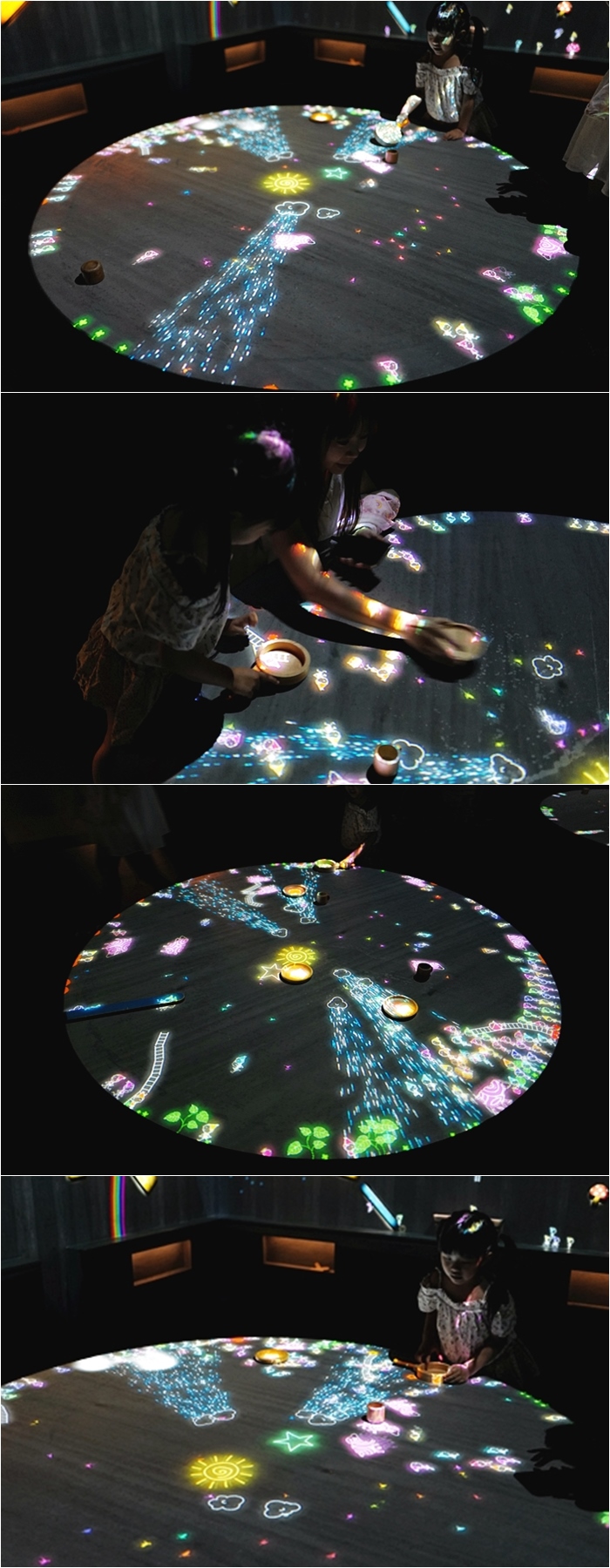 | 這兩個大圓桌就多人玩,可以用手輕拍,也可以利用桌上提供的木圈互動,套住粉紅色的綿羊或是雲朵跟太陽,就會有不一樣的變化,會下大雨或是產生氣泡等等的反應。 |