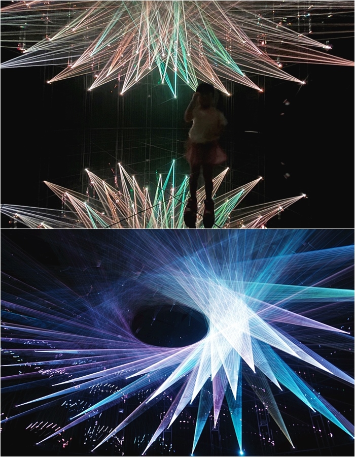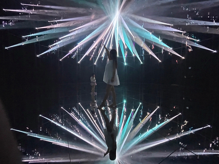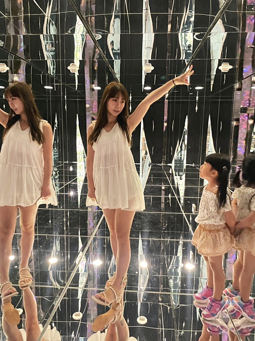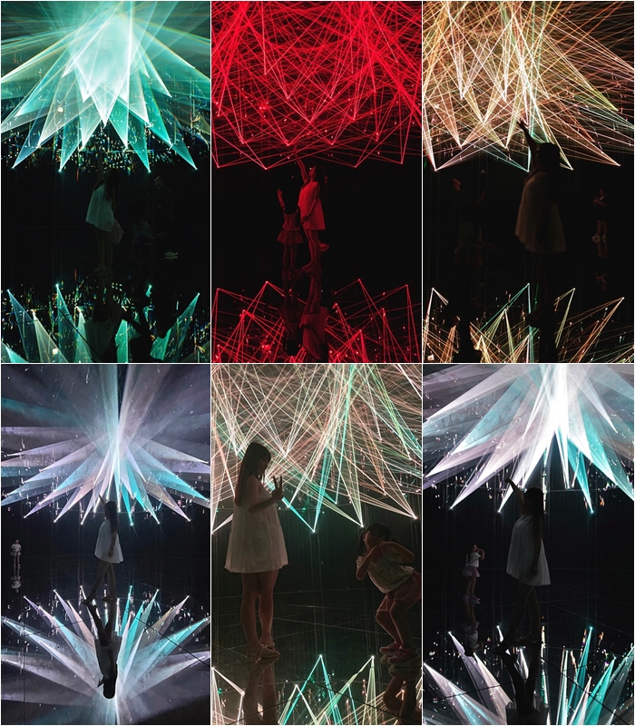 | 底下都是鏡面玻璃,搭配上方的雷射光變化同時造型像是萬花筒的世界變化,很有舞台效果的一個空間,這空間不大,所以要等到都沒人的時候需要比較久的時間。 |