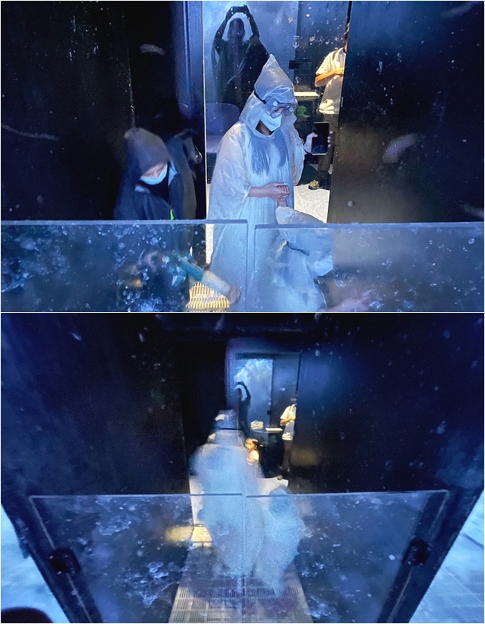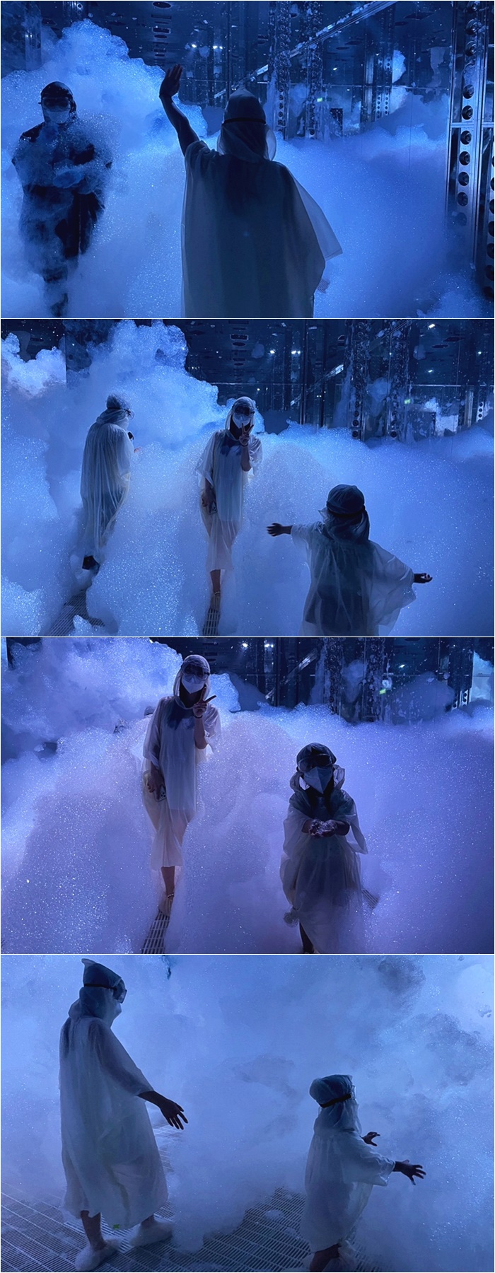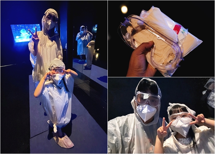 | 這一個空間我們還滿期待的,這邊排隊也排滿長的,進場前還需要戴上眼罩跟口罩、雨衣,現場個工作人員都會準備好給每個客人,這空間每個人只能進場一次,不能重複進場,口罩還是N95口罩。 |