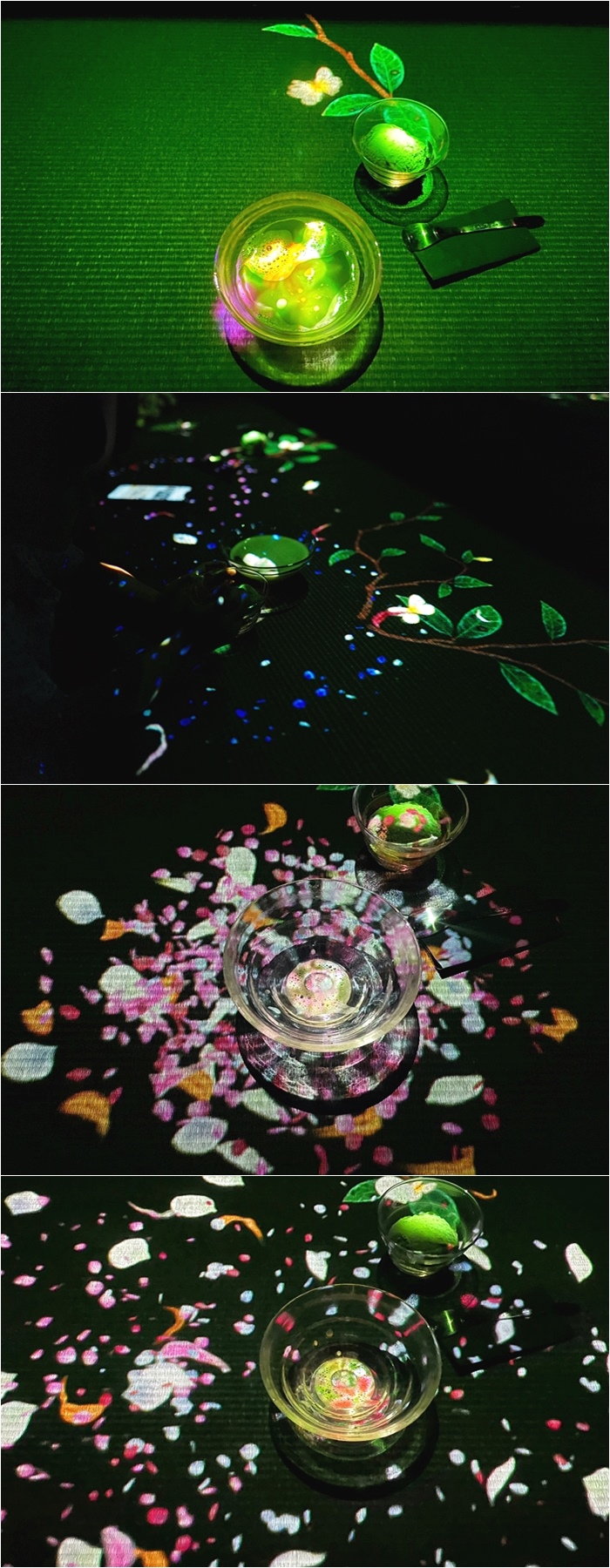 | 入座後就可以看到座位上的投影變化,每個人都是固定一杯茶跟冰品,口味可以選,但是套餐內容固定,這時候會依造茶跟冰品引用的程度作變化,偵測到裡面還有水的時候還是滿滿的花瓣,一喝完放下就會看到花遍整個都飄散開了,,我的抹茶冰也是會從冰品裡面長出枝枒,非常特別的飲食體驗呢! |