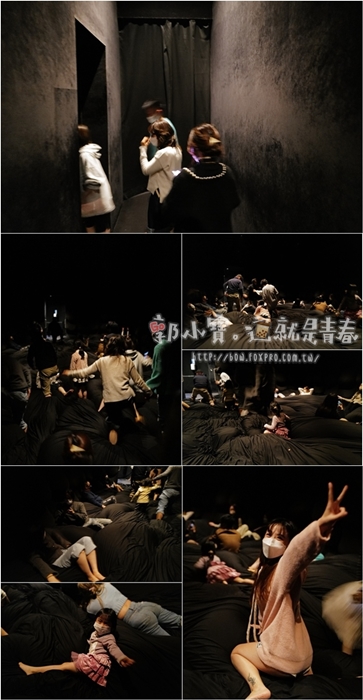 到達後會有乾地板,走一小段就進入了第一個空間,柔軟的黑洞,這個空間我女兒玩的超開心,是一個不規則的空間,每一步都會陷入地面,基本上大家都是連滾帶爬的過去,重點是就連你要要滾的都很難前進,超多人索性就躺在這裡休息夠了再繼續往前,這地方笑聲不斷,真的滿搞笑的。