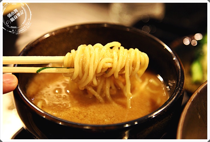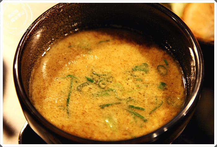 | 沾麵的醬汁看起來相當的濃郁,淺嚐了一口確實比拉麵的湯頭更鹹了一點,帶有一點辣度,但是整體來說入口後那濃郁的味道會逐漸在口中散開,很棒的一碗沾麵醬汁,但是整體的感覺比較像是味噌跟豚骨的結合。 |