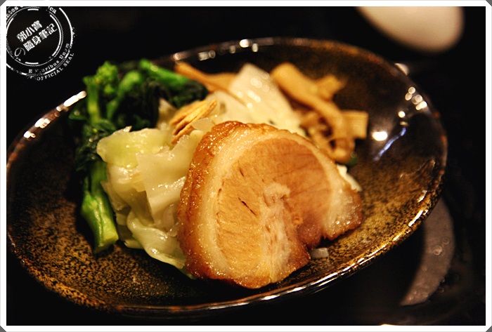 | 旁邊還有一疊小菜跟叉燒,叉燒的厚度依然跟拉麵一樣大小,只是她們家的叉燒真的很棒,肥瘦比例抓的剛剛好,厚度夠厚咬起來口感相當的好。 |